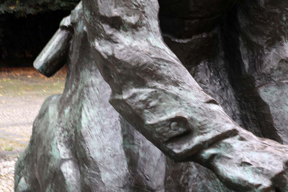 El elemento central está compuesto por seis pilares de acero de aproximadamente diecisiete metros de altura dispuestos en círculo. Su disposición vertical y su separación generan la imagen abstracta de una explosión congelada en el instante de su expansión. En el centro se sitúa una escultura de bronce de dos metros y medio que representa a un zapador arrodillado desactivando una mina, capturando el momento de máxima tensión y concentración. La composición envuelve al visitante y crea un espacio casi ritual, donde la verticalidad del acero contrasta con la vulnerabilidad humana representada en la figura central.